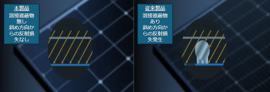 セル正面に溶接遮蔽物がないことで2.27%光線吸収率UP