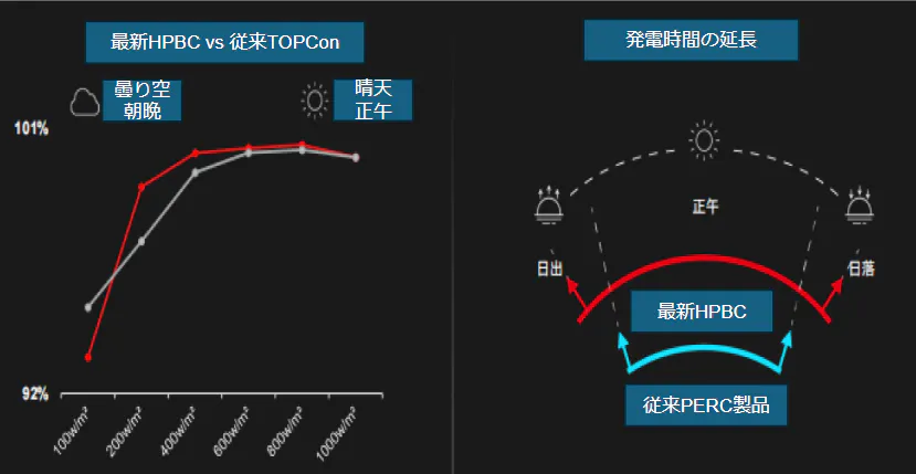 BC電池(背面接触型電池の総称)は、前面に金属グリッド線がない設計を採用しており、光線の遮蔽物がないことから斜めからの照射による反射損失がなく、発電量に著しい優位性を持っています。