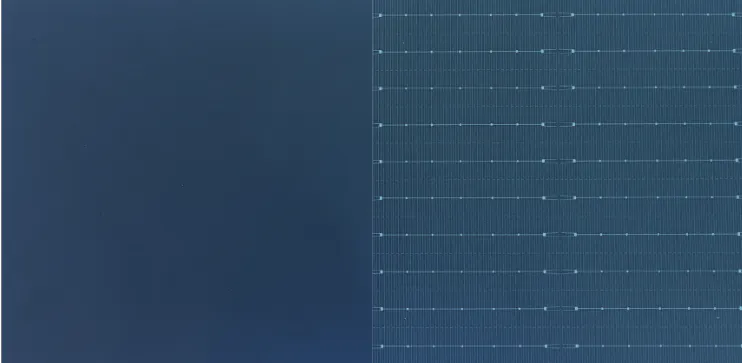 HPBC テクノロジーは、Hybrid Passivated Back Contact の略で、前面にバスバー(配電盤や制御盤に電源を各部分に接続する導体棒のこと)がある従来のフロントコンタクト型太陽電池とは異なり、HPBC セルでは電気接点が背面に移動しています。