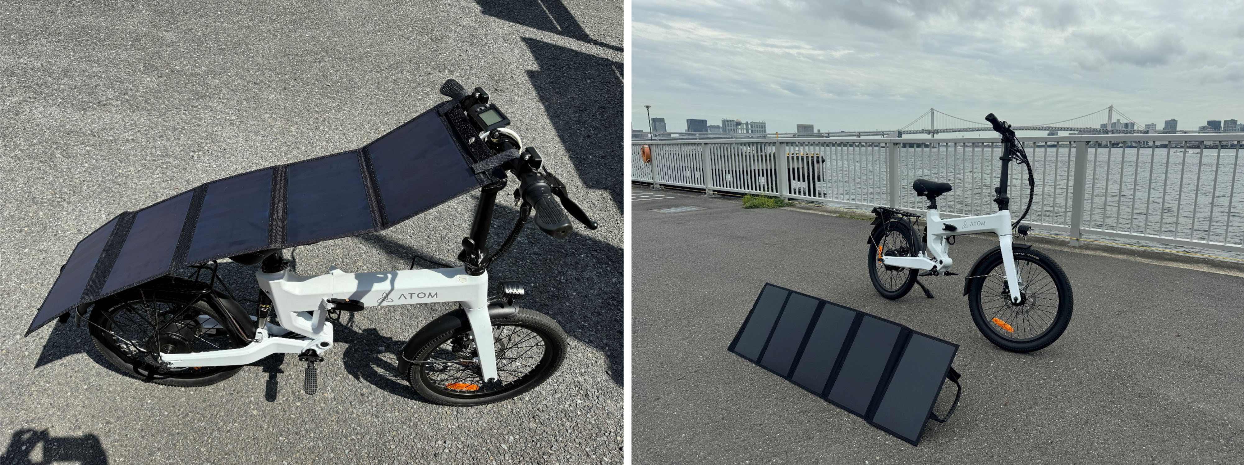 付属品のソーラーパネルは、ATOM Full eBikeを外出先のどこででも気軽に充電ができるよう、車両に常備して移動ができるように開発しました。