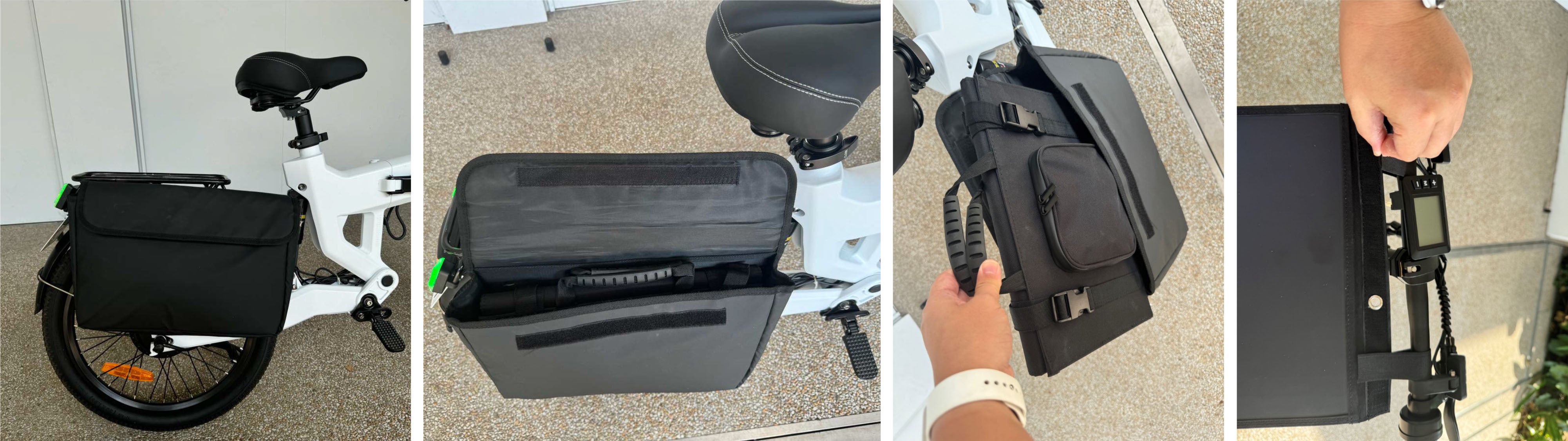 後部キャリアに装着した専用バッグに常時搭載可能/盗難ロックをして、ハンドルバーと固定