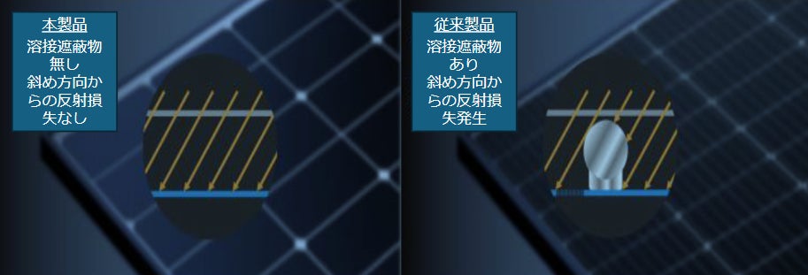 セル正面に溶接遮蔽物がないことで2.27%光線吸収率UP