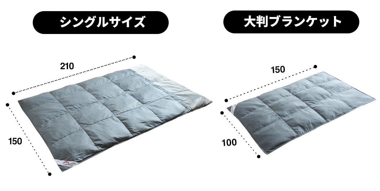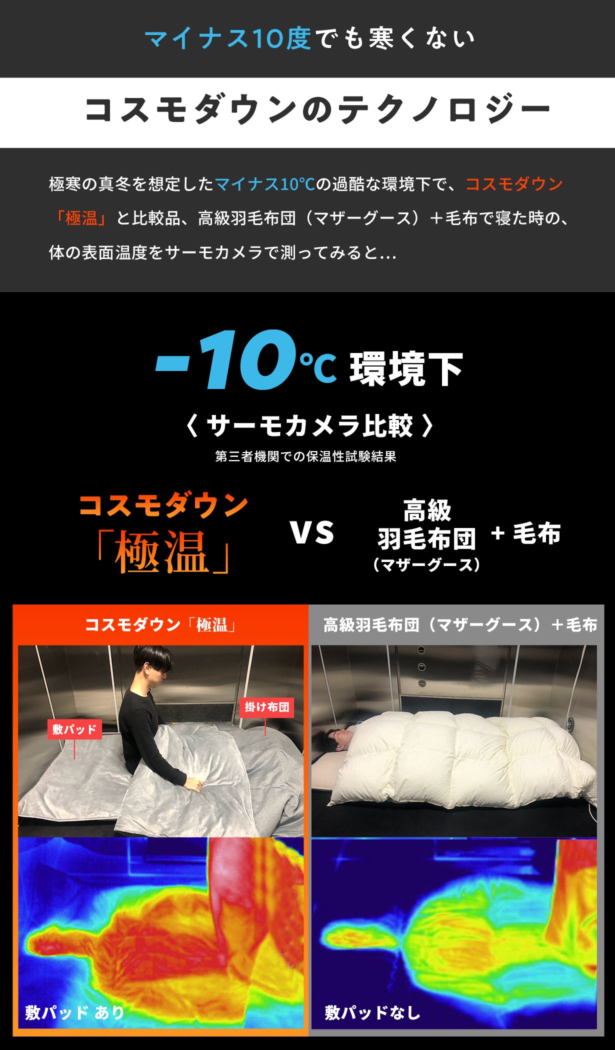 コスモダウンは厚さが約3cmと薄いため、長さを保つことができるので身長180cmの方でも隙間が出来ず、暖かさで包み込みます。