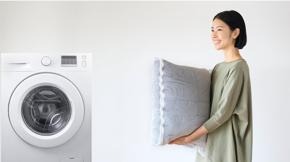 A. ご家庭の洗濯機でお洗濯いただけます。洗濯水は30℃以下の水を用い、ネットに入れて中性洗剤を使用し弱水流でお洗いください。