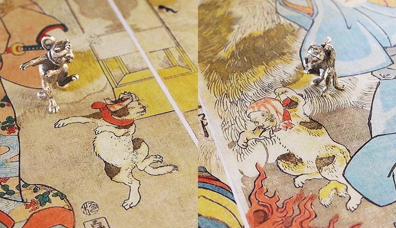 猫は年をとると尻尾が二股に分かれて妖力を持った化け物になるのだとか…。モチーフになっているのは江戸時代に活躍した人気浮世絵師・歌川国芳の作品。一つは、頭にハチマキを締めながら楽しそうに踊る猫又を表現。両手を横に突き出し、足を高く上げながら踊る姿は躍動感たっぷりです。もう一つは頭に手ぬぐいを被ったまま踊る猫又を表現。何かを誘っているかのようなポーズで踊る姿がとってもコミカルです。