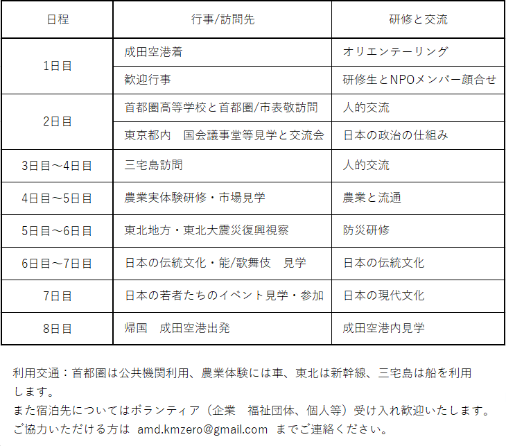 私たちはザビエル高校の学生2名を2024年の夏休みに日本へ短期研修させることを計画しています。研修先は首都圏と東北です。東京の観光スポットや能、歌舞伎の見学や若者文化に触れ、歴史的な建造物を見学し、千葉での農業宿泊を体験や更には東北の復興の姿を見に行くことを予定しています。