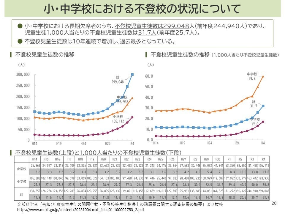 不登校の人数は、子どもの数が減っているにもかかわらずここ10年間毎年過去最高を更新しており、直近の調査では小1~中3で約30万人にもなります。
