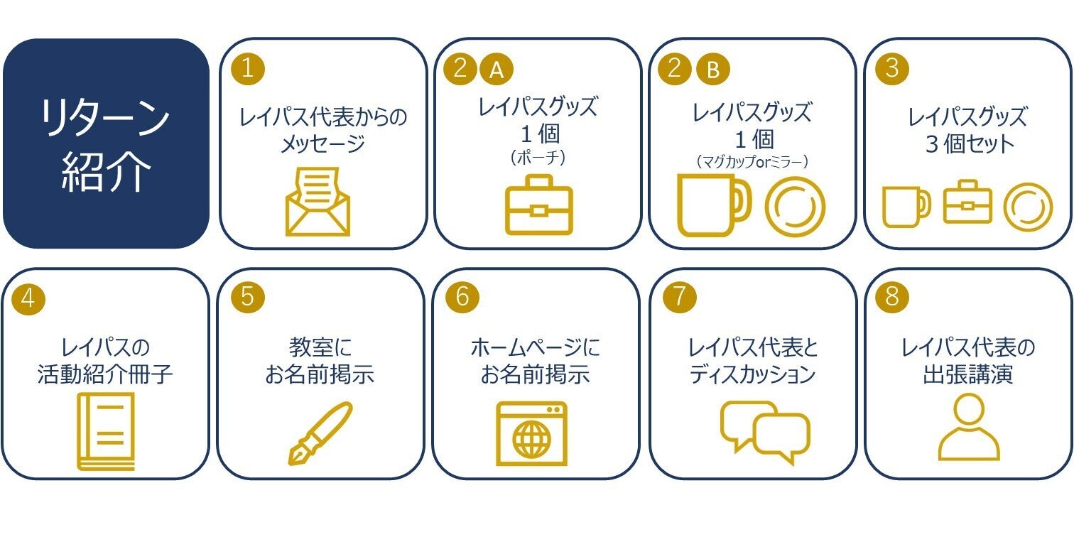 ②レイパスグッズ1個 レイパスの生徒がデザインしたグッズです。製作原価・送料の違いにより、リターン金額を分けさせていただいています。