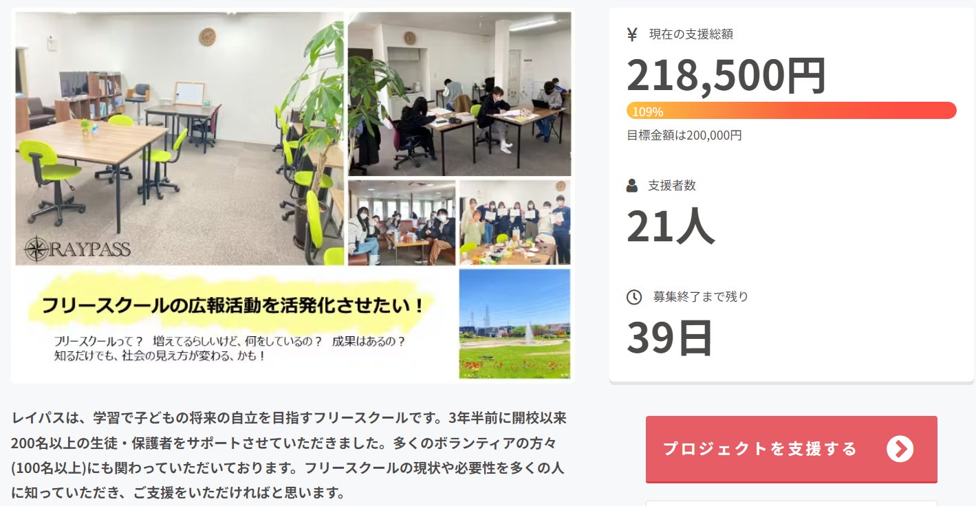 2024/06/06 12:115/15に開始した当プロジェクトですが、6/1に目標金額を達成することができました!想定しておりましたレイパスグッズの製作が可能となり、また、プロジェクトを通じてフリースクールの現状を色々な方に知っていただくことができたのではないかと思っております。ご支援いただきました皆様には、最大限の感謝を申し上げます。7/13までがプロジェクトの期限なのですが、早々に達成することができ、フリースクールレイパスという場所および、そこで学ぶ子どもたちが、社会の皆様から大いに応援いただいているのだと改めて実感し、大変嬉しく、ありがたく思っております。ネクストゴールとして、ノートパソコン&周辺機器導入(目標額+17万円)を目標にさせていただきます。(1)解決したい課題レイパスの課題として、ITのハードウェア面の弱さがあります。教室には15年前の大変古く動作が不安定なノートパソコン(代表のお古)しかなく、生徒・広報スタッフはスマホや自宅のパソコンで必要な作業を行っています。共有のノートパソコンの導入により、以下が実現できます。① 広報のスピード・品質向上広報スタッフが教室にてタイムリーに写真・動画編集などの作業を行うことができ、広報の活性化につながります。② 生徒のITリテラシー向上生徒たちは、IT企業出身のスタッフの指導の下、探究レポートやイベント企画などの活動をパソコンを使用して行うことができ、スマホだけでは十分には身につきにくいITリテラシーを獲得することができます。生徒たちの活動の成果をホームページや活動報告書に掲載することで、レイパスでの学びの広報にもなります。③ 生徒の学び多様化現在プロの方に行ってもらっているホームページの管理・編集作業を、生徒たちの学びの一環としてレイパスで実施していきたいと考えており、その際の活用も考えています。(2)資金の使い道ネクストゴール目標金額:17万円 ノートパソコン:10万円(写真・動画編集、レポート作成、ホームページ編集作業に耐えられるスペック) セキュリティソフト:0.7万円(3年契約) 通信環境改善:3.6万円(現状の通信制限ありのプランから制限なしプランへグレードアップ、2年分) 周辺機器:2.7万円(マウス・外付けSSD常用/バックアップ用・USBメモリ・SDカード・外付け光学ドライブなど)目標額より多くのご支援をいただいた場合、レイパスの運営費に使わせていただきます。目標額に未達の場合、金額に応じて、レイパスより補填して購入するなど対応を検討させていただきます。広報の向上だけでなく、生徒の学びにもつながるネクストゴールとなります。引き続きご支援のほど、よろしくお願いいたします。 もっと見る