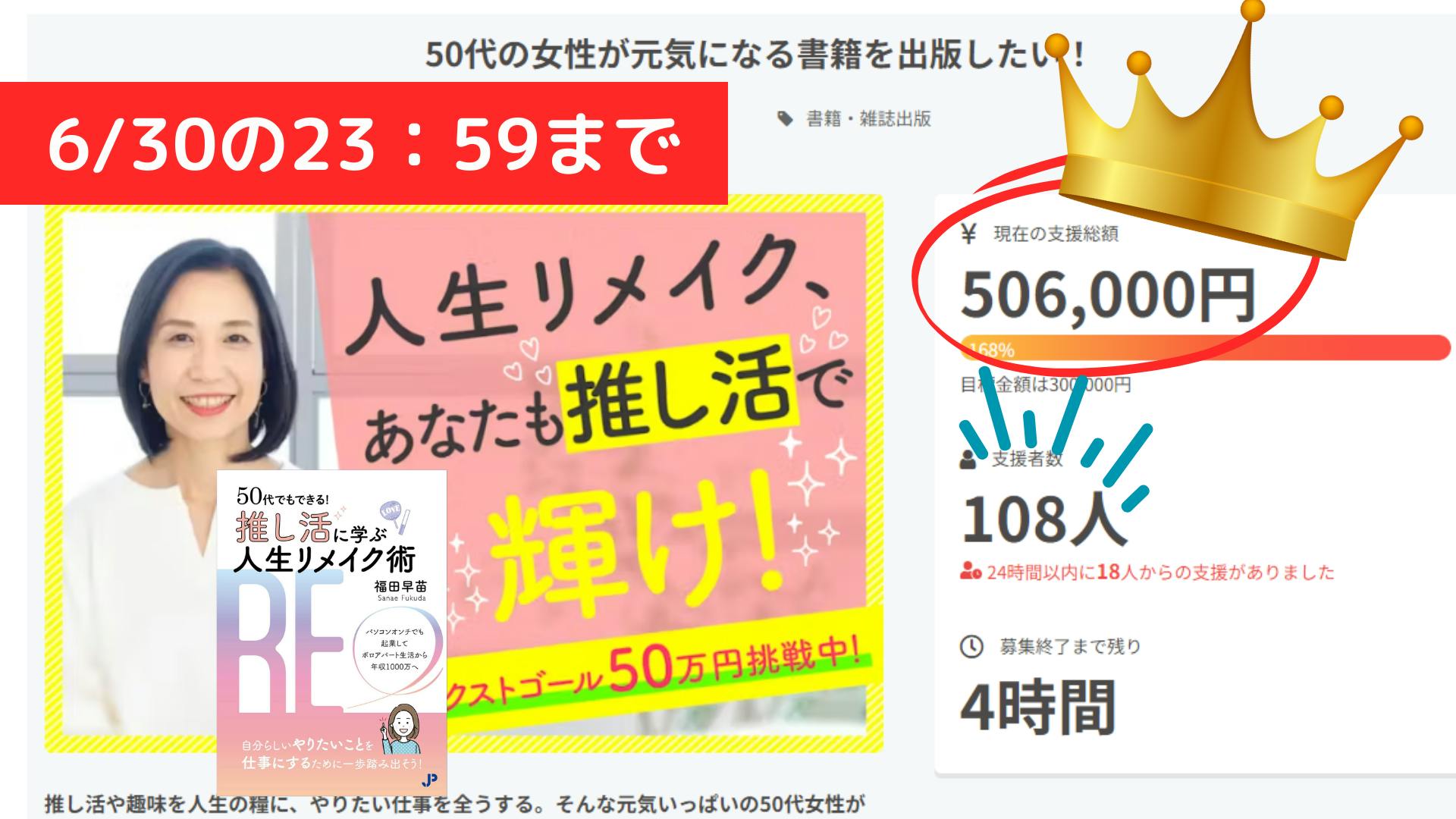 2024/06/30 19:29ネクストゴールの50万円を達成しました!!みなさまのお陰です!ありがとうございます!!約1ヵ月CAMPFIREでクラファンにチャレンジして初めの目標金額は30万円こちらをクリアしてネクストゴールは50万円を設定しました。最後の最後の追い込みで最終日に50万円を達成することが出来て感無量です。50万円クリアのご支援者の方からは「福ちゃん頑張っているから支援させてもらったよ」というメッセージ。SNSを毎日更新して近況報告をしたり、メルマガやLINEでつながりのある方にアプローチしたり個別でお願いしたりすることで目標って達成できるんだ!ということが実感を持てました。これはひとえに皆さまにサポートしていただいたり応援のシェアをしていただいたりご支援をいただいたことでできたことです。決して一人ではできない事です。本当にありがとうございました!この経験を私と関わってくださるみなさまへ勇気付けできたらいいなと思いました。人生100年、50歳はまだ折り返し。これからの後半を勇気をもって挑むとこうやって嬉しいことがあるんだなと思いました。ひきつづきご支援いただいた皆様にはリターンのお届け方法などをお送りさせていただきます。まだ、あと4時間あるのでもうひと踏ん張り頑張りたいと思います!本当にありがとうございました!!!m(__)mご支援者の108名の皆さまには感謝申し上げます。今夜22時から感謝のInstagramLIVEを行います。良かったお越しくださいませ。福田早苗Instagram もっと見る