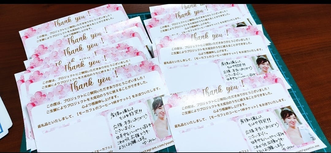 2024/09/10 07:13こんにちは!産後TOMOサポ、ゆーみんです。9月をむかえ、少し涼しく過ごしやすくなってきましたが、お元気ですか?さて、クラファン後の返礼品などの準備を進めています!まずはコーヒーチケットのご用意を…そしてメッセージカードもご用意しました。この週末に、郵便で投函しましたのでコーヒーチケットをえらんでくださったみなさまのお手元にそろそろ届く頃ではないかと思います。よろこんでいただけるといいな!(全面的にサポートしてくださったまやさん、本当にありがとう!)お茶会ご希望の方は、別途、日程調整をしたいと思います!モーカフェとっても素敵な場所なので、ごいっしょにお話できるのを楽しみにしておりますよ~♪モーカフェまた、ハーブティ送付の準備も現在進めておりますので、ハーブティを選んでくださったみなさま、少々お待ちくださいね。さて、並行して、NPO法人設立準備もすすめています。産前産後のママパパの力になりたい!こんなはずじゃなかった!思ってたのと違った産後や子育てを、変えたい。これから生まれてくる赤ちゃんや、ママパパがもっと笑顔で、よゆうをもって子育てしたり、仕事ができるような世の中にしたい。そんなふうに思っています。想いに共感してくださっていっしょに活動してくださるボランティアさんも募集します。とりあえず週1回くらいオンラインでミーティングしたりミーティングと称して、月1回くらい、ご飯食べたり、飲み会したり(←子連れでも行けるとこがいいよね)子どもたちもいっしょにあそんだり…そんな感じでたのしくゆるゆると世界を変えたいな♪これからも、応援どうぞよろしくお願いいたします!産後TOMOサポ多田佑実 もっと見る