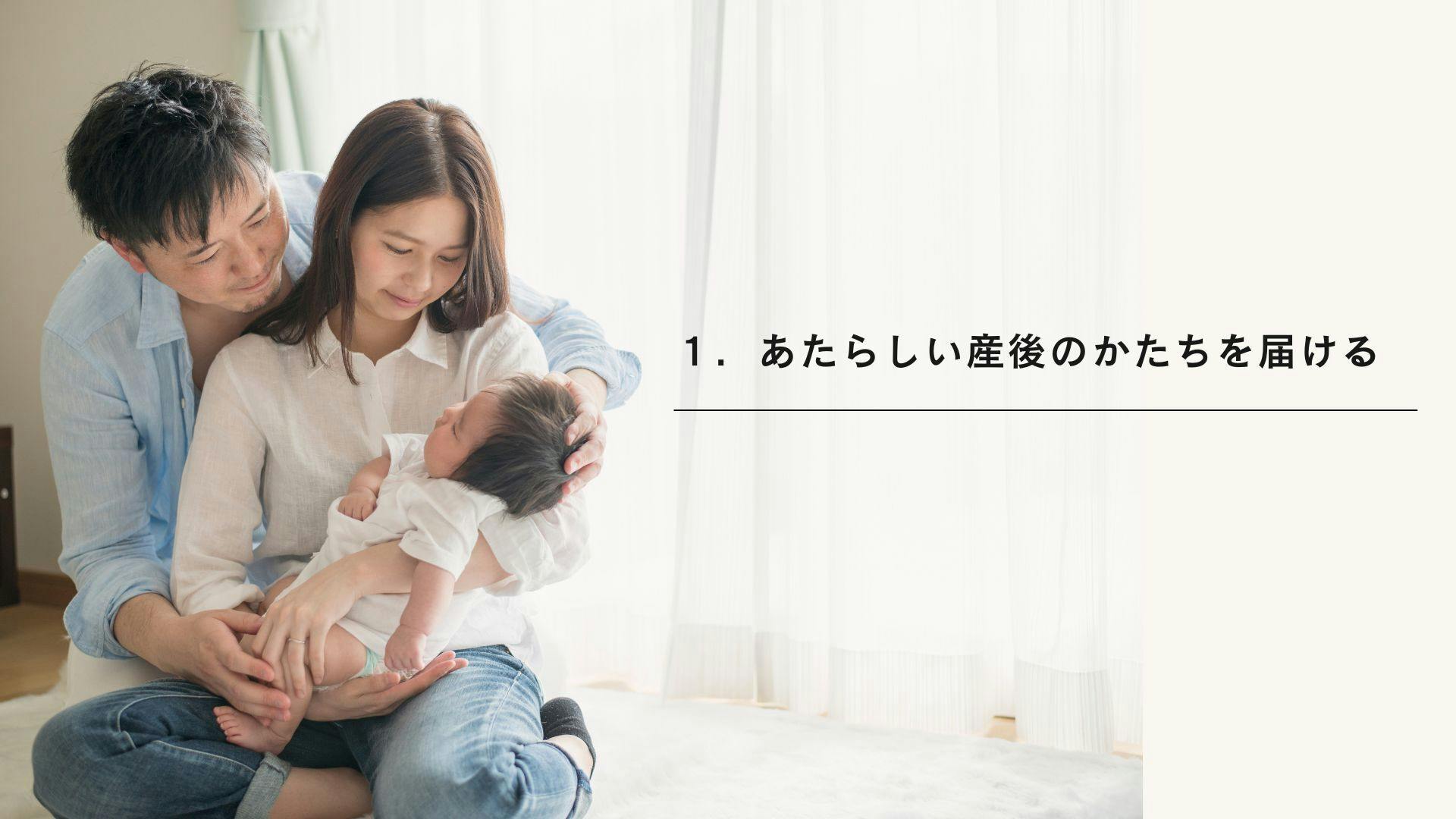 『妊娠~産後にまつわる体や心、赤ちゃんとの生活に関わる正しい情報』 を多くの人に知ってもらうとともに、『ご家族が産後の暮らしを整える、仕組み』をつくること