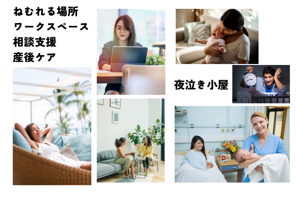 理由問わずあずけられる一時保育。寝不足のママが仮眠をとったり、自分の時間を過ごせるスペース。産後ケア。相談支援や学びの場もあり、必要な産前産後サポートにつながる場所。ワークスペースも完備。しんどい夜泣きに対応する夜泣き小屋。