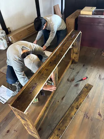 壁の補強・断熱を兼ねた漆喰塗りや床張りや滞在用の家具製作、キッチンリフォームなどを行い現在は、テレワーク施設と滞在施設として利活用され、様々なセミナーやスポーツ合宿などに使用され地域活性化に繋がっています。