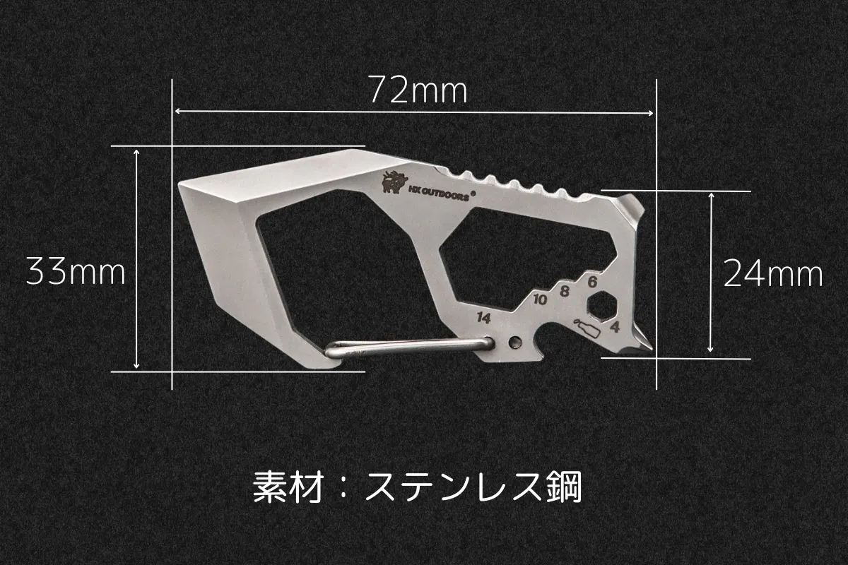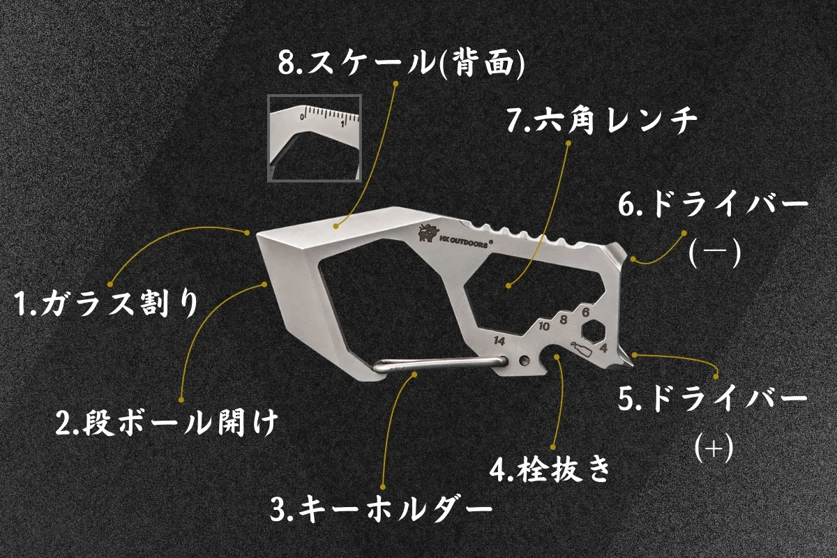 A: Sharkeyには、段ボール開け、六角レンチ(14号、10号、8号、6号、4号)、栓抜き、プラス・マイナスドライバー、スケール(2センチまで測定可能)、緊急脱出ガラス割り、缶詰やプルトップ開け、ホチキス針取り、キーホルダー機能が搭載されています。