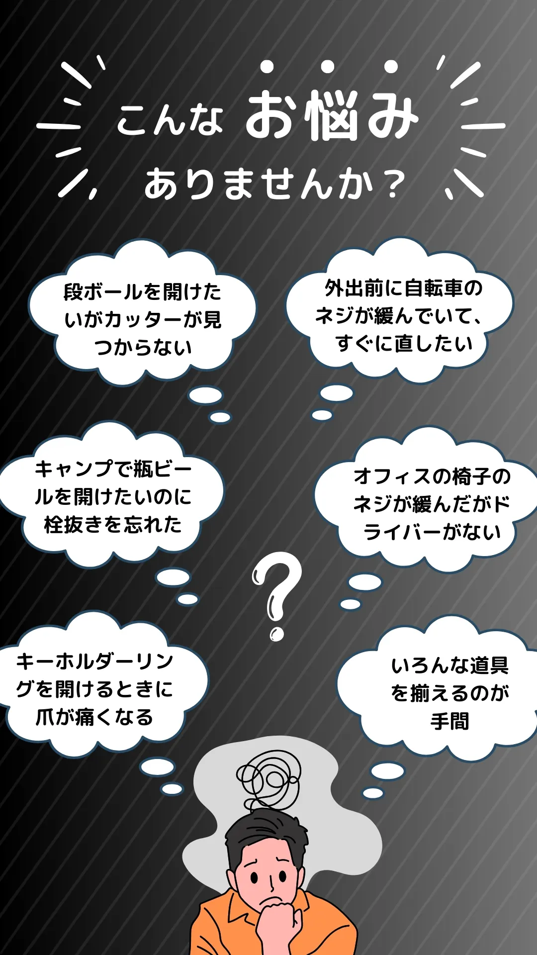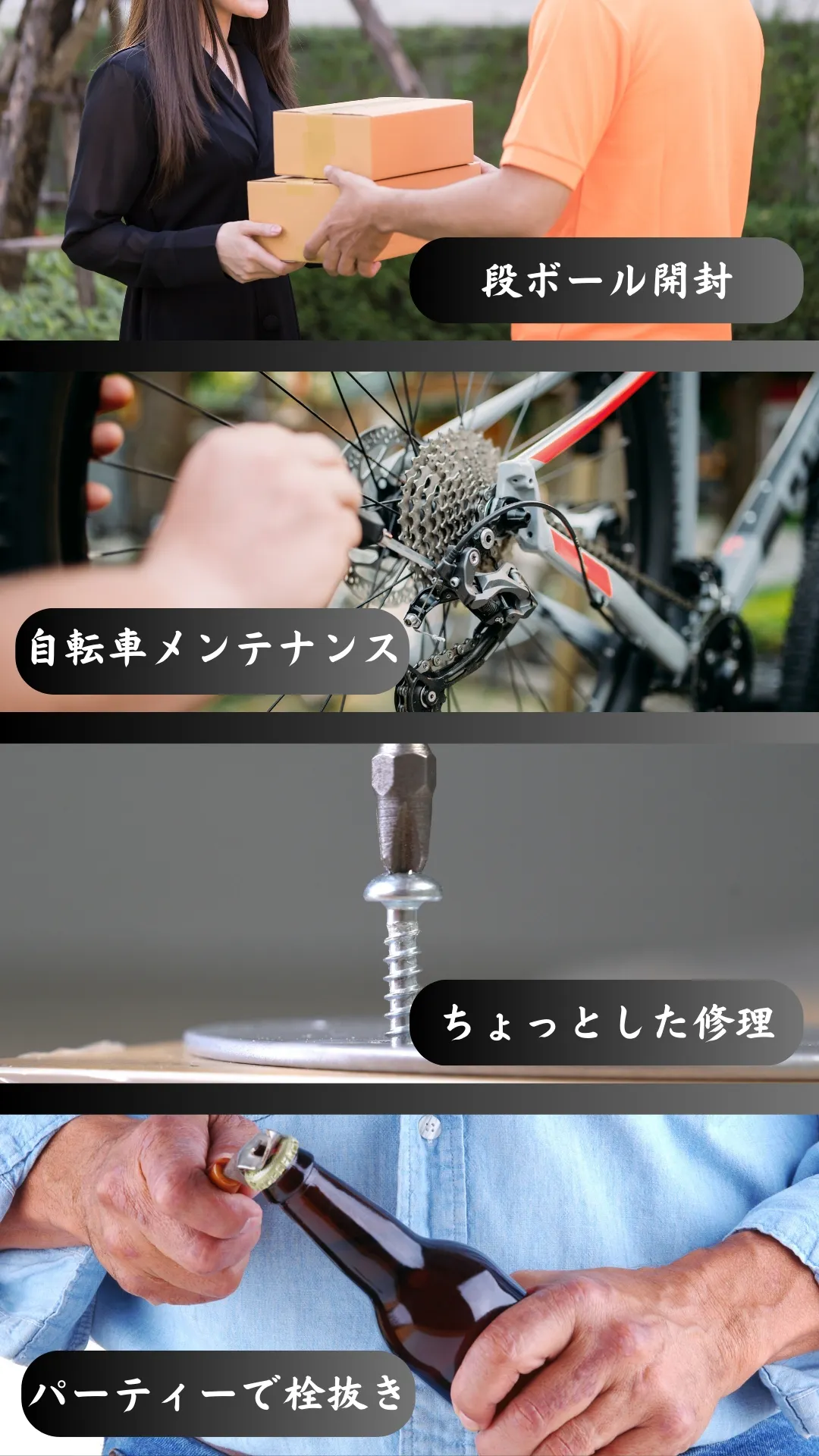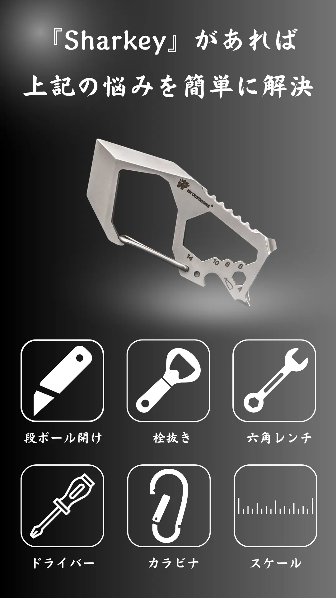 Sharkeyは、日常生活で多くの人が感じている「ちょっとした困りごと」を解決するために企画されました。段ボールを開けたいのにカッターが見つからない、出かける前に自転車のネジが緩んでいて手早く直したい、キャンプで瓶ビールを開けたいのに栓抜きを忘れてしまった、オフィスの椅子のネジが緩んでいるけどドライバーが手元にない、キーホルダーのリングを開ける際に爪を傷めてしまう――こういった日常的な困りごとに、多くの道具を揃えるのは手間がかかります。
