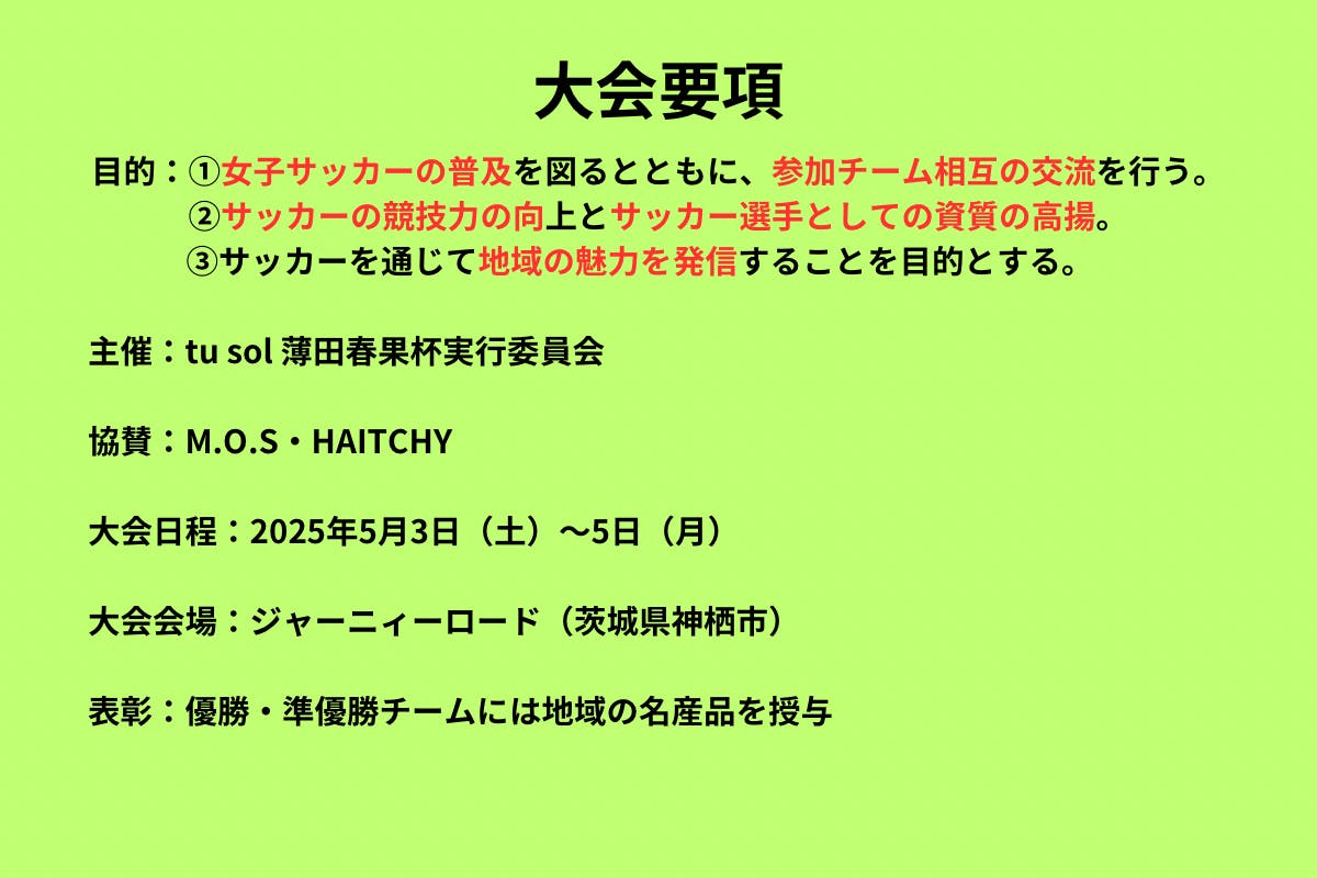 今まで二回開催させていただき、地域の皆様や参加いただいたチーム関係者の皆様に大変喜んでいただけました。様々な意見を元に今年度からはGWに移行し、開催場所も茨城県に変更させていただき多くの女子選手の活躍の場を提供したいと考えております。