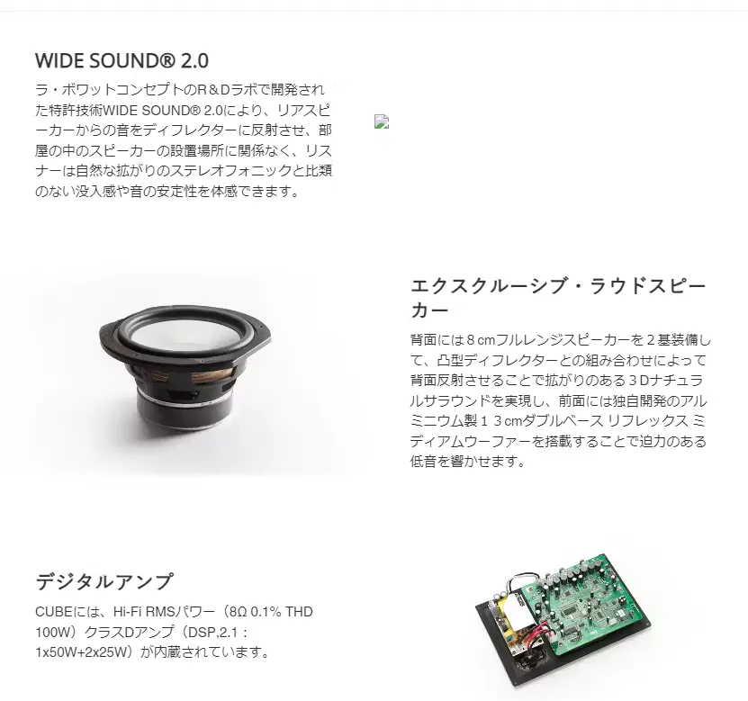 ラ・ボワットコンセプトの全てのスピーカーは、最適な再現品質を保証するHi-Fiシステムのカスタムメイドです。CUBEシリーズはそのサイズと使用環境を考え、CUBE専用に開発されたオリジナルスピーカーシステムで構成されています。