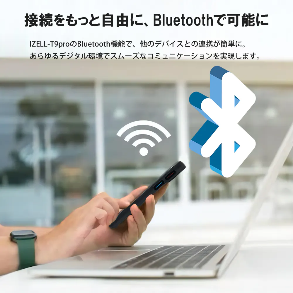 IZELL-T9proはBluetooth対応で、スマートフォンやタブレット、パソコンなどの他のデバイスと簡単にペアリングできます。