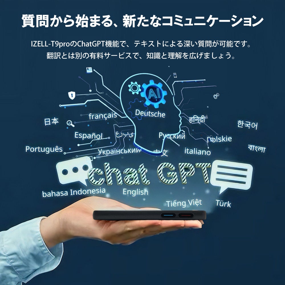 IZELL-T9proの機能の一つに、ChatGPTがあります。これはテキストベースで質問を投げかけ、翻訳機能とは別に詳細な回答や情報を提供する高度なAI機能です。