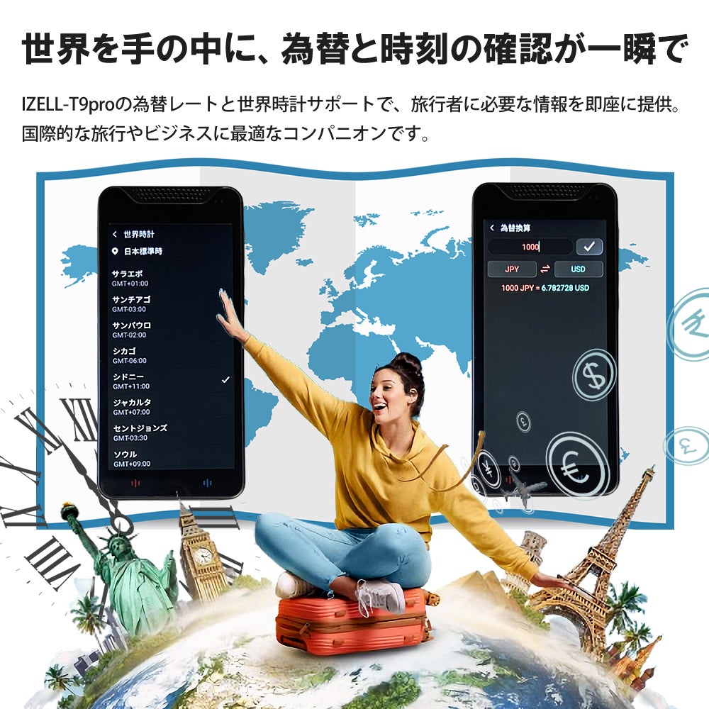 IZELL-T9proは、旅行者にとって非常に便利な為替レートと世界時計サポート機能を備えています。この機能により、世界中どこにいても現地の通貨レートを瞬時に確認でき、また様々な国の正確な時刻もすぐに知ることができます。