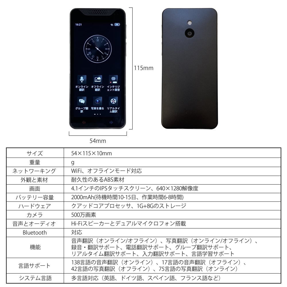 音声翻訳 (オフライン)17言語 英語、日本語、韓国語、簡体字中国語、繁体字中国語、ドイツ語、フランス語、スペイン語、イタリア語、ポルトガル語、 ロシア語、オランダ語、アラビア語、タイ語、インドネシア語、ヒン ディー語、ベトナム語