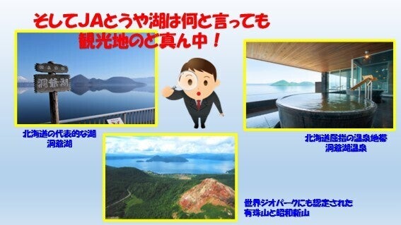 JAとうや湖は北海道の代表的な湖である「洞爺湖」を中心に洞爺湖温泉や世界ジオパークにも認定された昭和新山、有珠山など観光地のど真ん中に位置しております。