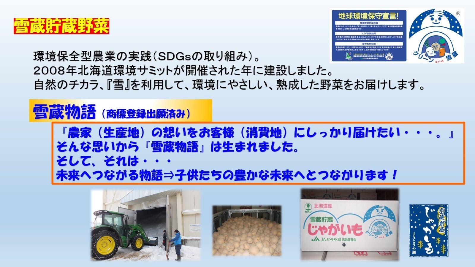 北海道洞爺湖町周辺の4市町(洞爺湖町・豊浦町・壮瞥町・伊達市大滝区)からなる北海道で最初の広域合併農協です。当農協はグローバルGAPを日本で最初に取得したJAであり、イエス・クリーン認証を16作物15集団が取得するなど、安心安全な農業を実践し多種多品目を生産している地域です。当農協では「子どもたちの豊かな未来へ」をスローガンにクリーン農業を実践しています。