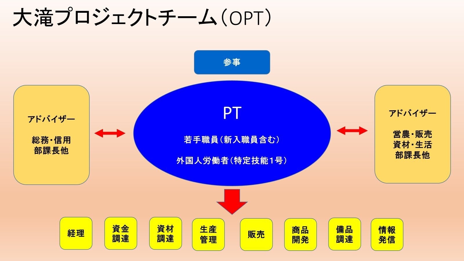 大滝プロジェクトチーム(OPT)では入組5年目以内の若手職員が中心となり、それぞれの通常業務でつけた力を発揮することで経理から情報発信まで全て自分たちで行っております。しかし、若手職員は農協職員としての経験が浅いため分からないことも多々あります。若手職員が困っているときにサポートしていただいているのが座長(参事)やアドバイザー(各部署の部長、課長)、組合員(農家さん)の方々です。このようにして私たち若手職員は多くの経験を積ませて頂いております。また農協としての強みを発揮できる体制となっております!そんなOPTの合言葉は「下手から始めよう!高望みはやめよう!少しずつ上手になろう!」です。通常業務、OPT業務を通じて農協職員として日々成長しています!!