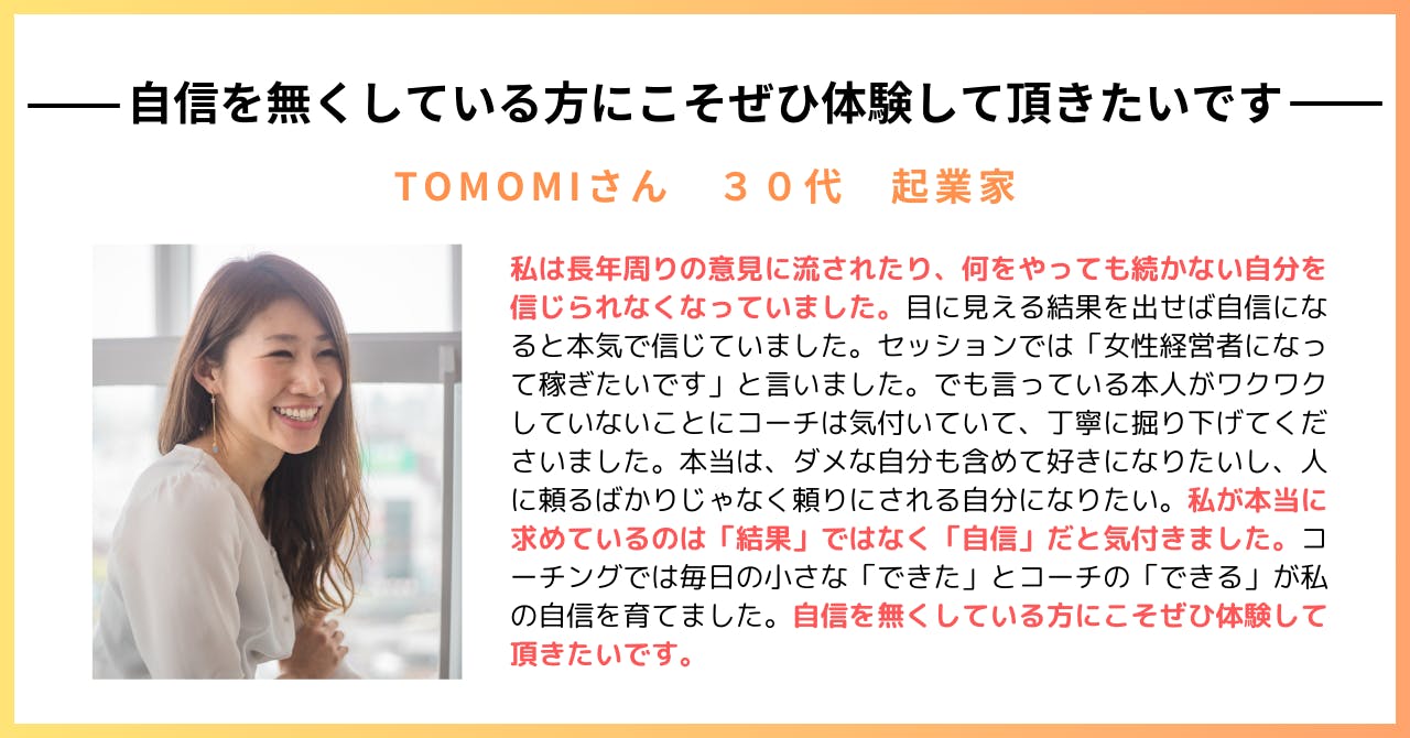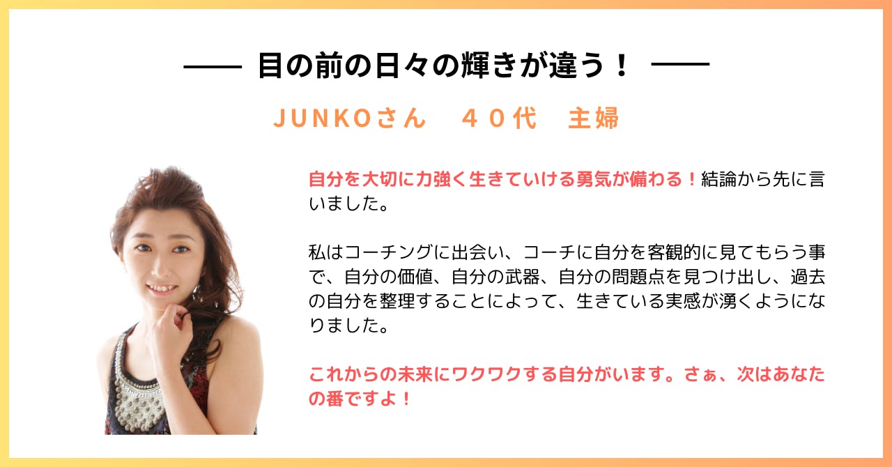 A:コーチングは何か成果をお約束するものではありませんが、お悩み解決と叶えたい未来に向けて尽力させていただきます。