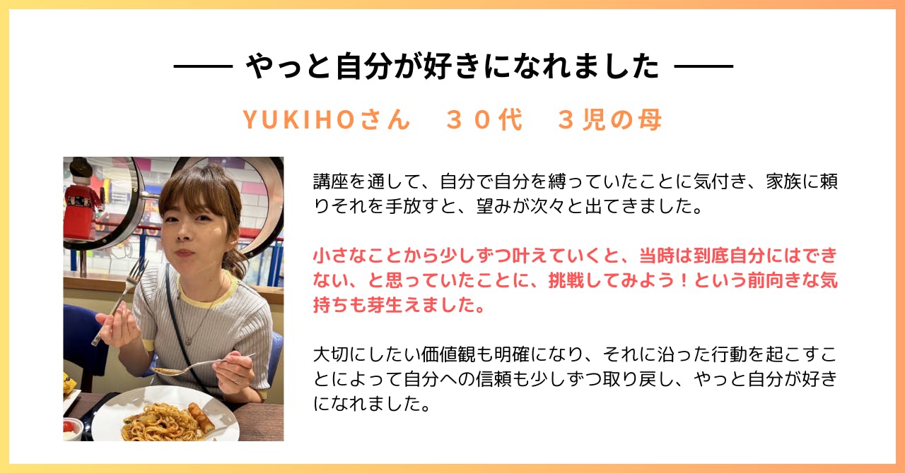 疎遠だった母親とまた笑って話せるようになったり、今は日本に住んでますがオランダ移住の夢を叶えたり、このTrueSelfをつくったり、家族で夢を描きながら、幸せな日常を過ごすことができるようになりました。