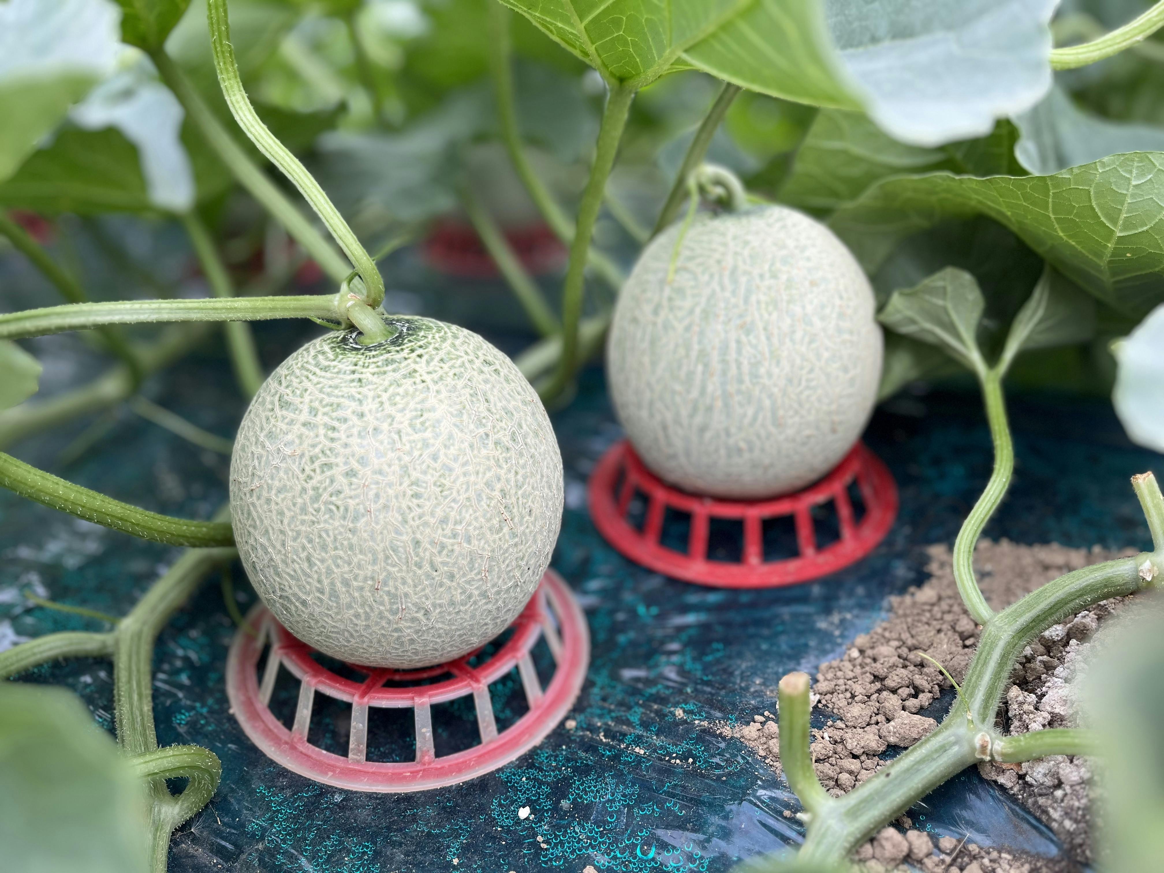 今シーズン最初に植えたハウスメロンにネットがかかってきました!まだまだ浅いネットですが、ネットが入りはじめると、一気にメロンらしくなりました。