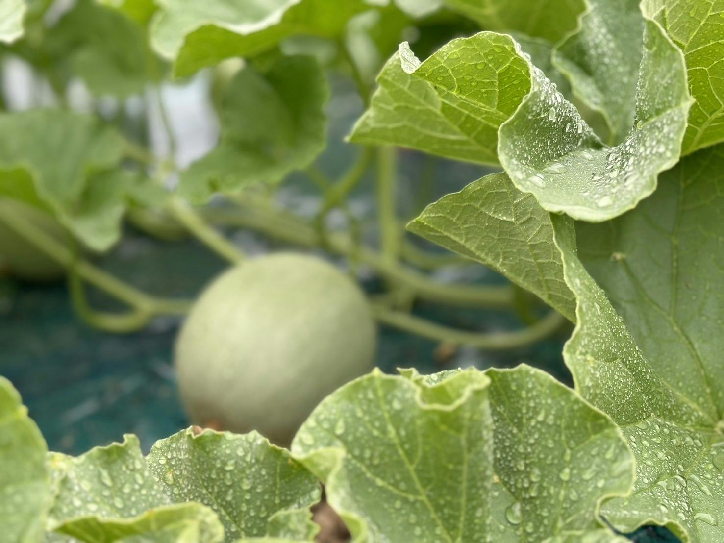 シーズン前半は雨の少なかったニセコ町ですが、7月に入ると雨の日が多くなってきました。なかなか雨模様の剪定作業の様子を写真におさめることがないのですが、しっとりと雨雫がついたメロンもまた美しいです。