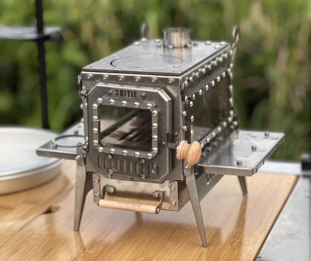 ❶ 手軽に持ち運べてテーブルにも置ける、小型ながら本格薪ストーブ