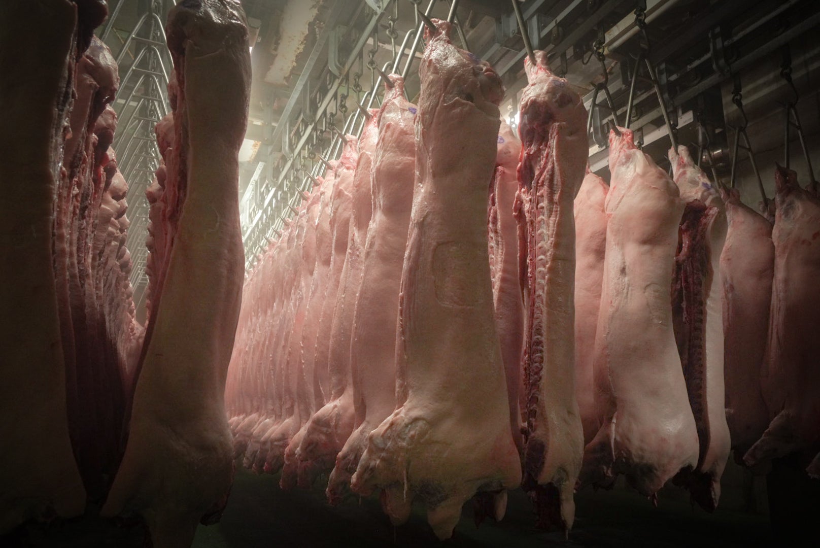 (↑写真は大きな冷蔵庫の中に並ぶ豚枝肉)