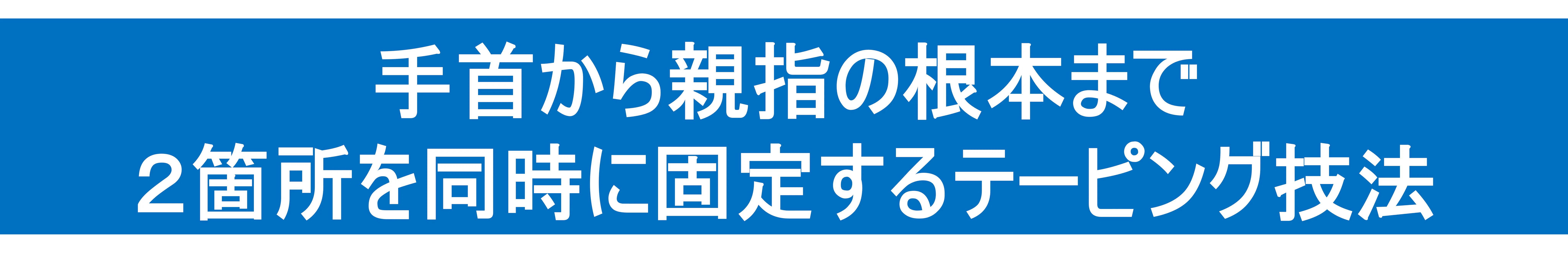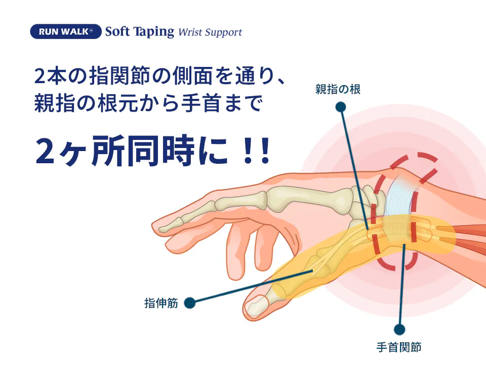 親指の根元から手首まで2ヶ所を同時に固定する方法であるテーピング技法を用いることで、手首の動きを抑制し筋肉の固定を可能としています。