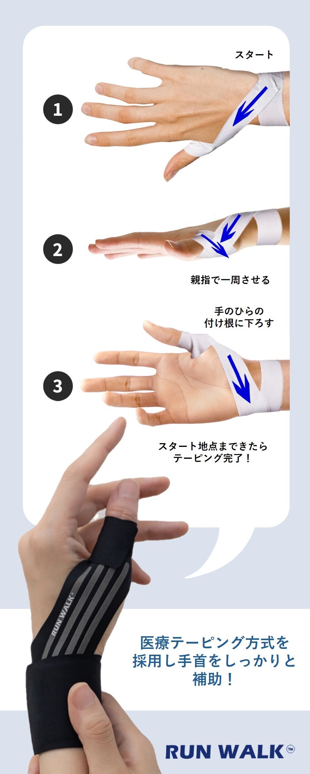RUNWALKソフトテーピング手首サポーターは、通気性が良く、手首と指をしっかりサポートできる製品です。