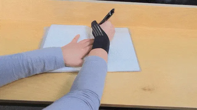 A.RUNWALKの手首サポーターは学生さんやビジネスシーンで活躍する方々にもお使いいただけます。親指や手首に過度な負荷がかかるのを防止するために考案された製品なので、筆記の際は親指の面ファスナーを少し緩めて可動性を確保しての使用がオススメです。