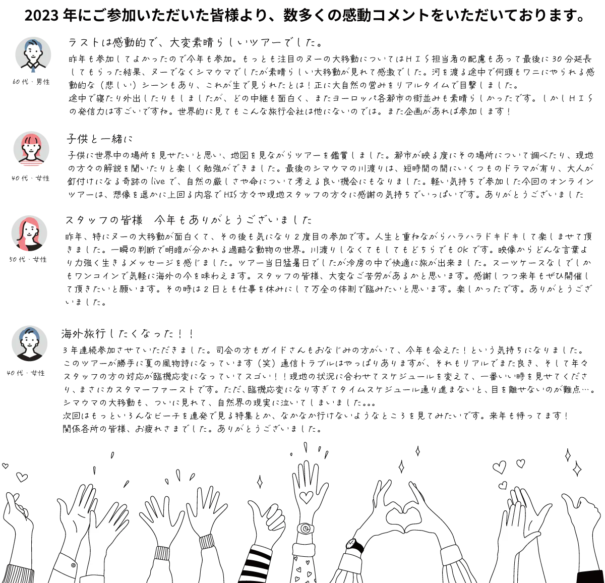 2024/07/23 09:27皆さまこんにちは!24時間ライブツアー運営スタッフです!今年も皆さまのおかげで無事終わり、ホッとしつつもまだ余韻に浸っているスタッフたちが24時間ライブツアーを振り返る座談会を行います。ぜひご参加いただき、一緒に語りませんか。HISスタッフ座談会 第4弾~今年も終わりました!24時間ツアー!日時:7月23日(火)20:00~Youtubeにて無料配信です▼ご予約はこちらhttps://www.his-j.com/oe/detail/T13/?area=O9&country=OEA&city=OEG&product=OEGzadankaiそして、クラウドファンディングも本日23:59までとなります。よろしければぜひ応援をお願いいたします!8月6日に開催する打ち上げ懇親会など、ぜひご参加いただけると嬉しいです。●打ち上げ懇親会ご招待 1端末(オンライン参加) + 御礼メッセージ 4,000円●打ち上げ懇親会ご招待 1端末(オンライン参加)+ IKUxMIRU1年間プラン 1名様分 +御礼メッセージ 25,000円また、好評につき追加したバッグも残り1つとなっております。●追加設定!【タイ雑貨 CHICO バッグ(大) + 御礼メッセージ 4,000円 ▼ご支援・プロジェクトページはこちらhttps://camp-fire.jp/projects/view/759489また、来年も皆さまとお会いできることを期待しつつ。本当にありがとうございました。HIS 24時間ライブツアー運営スタッフ一同 もっと見る【来年開催に向けて】クラウドファンディングは7/23(火)まで