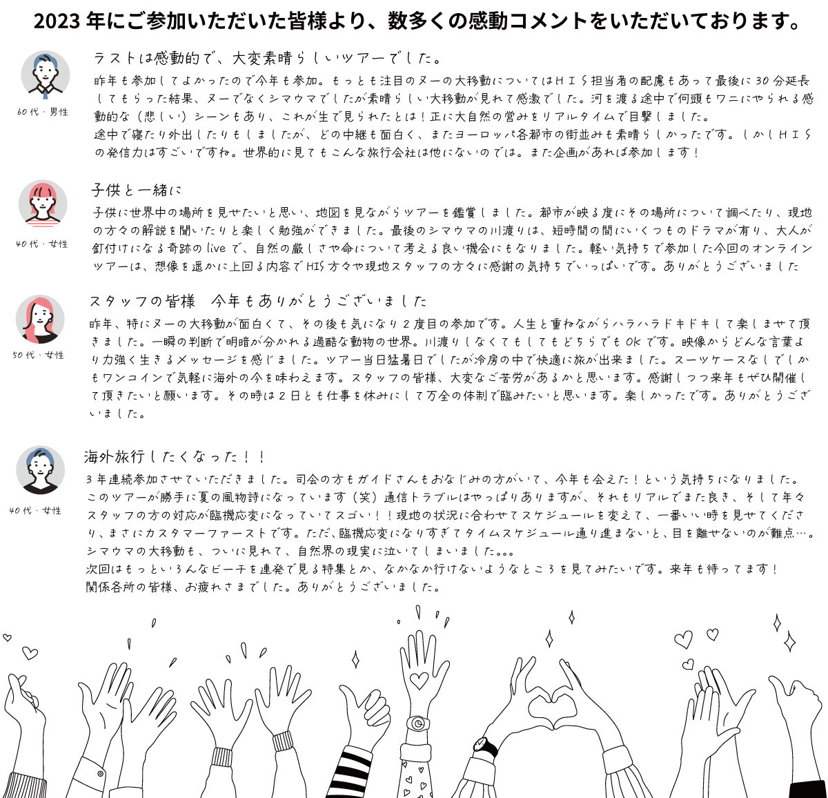 2024/07/23 09:27皆さまこんにちは!24時間ライブツアー運営スタッフです!今年も皆さまのおかげで無事終わり、ホッとしつつもまだ余韻に浸っているスタッフたちが24時間ライブツアーを振り返る座談会を行います。ぜひご参加いただき、一緒に語りませんか。HISスタッフ座談会 第4弾~今年も終わりました!24時間ツアー!日時:7月23日(火)20:00~Youtubeにて無料配信です▼ご予約はこちらhttps://www.his-j.com/oe/detail/T13/?area=O9&country=OEA&city=OEG&product=OEGzadankaiそして、クラウドファンディングも本日23:59までとなります。よろしければぜひ応援をお願いいたします!8月6日に開催する打ち上げ懇親会など、ぜひご参加いただけると嬉しいです。●打ち上げ懇親会ご招待 1端末(オンライン参加) + 御礼メッセージ 4,000円●打ち上げ懇親会ご招待 1端末(オンライン参加)+ IKUxMIRU1年間プラン 1名様分 +御礼メッセージ 25,000円また、好評につき追加したバッグも残り1つとなっております。●追加設定!【タイ雑貨 CHICO バッグ(大) + 御礼メッセージ 4,000円 ▼ご支援・プロジェクトページはこちらhttps://camp-fire.jp/projects/view/759489また、来年も皆さまとお会いできることを期待しつつ。本当にありがとうございました。HIS 24時間ライブツアー運営スタッフ一同 もっと見る【来年開催に向けて】クラウドファンディングは7/23(火)まで