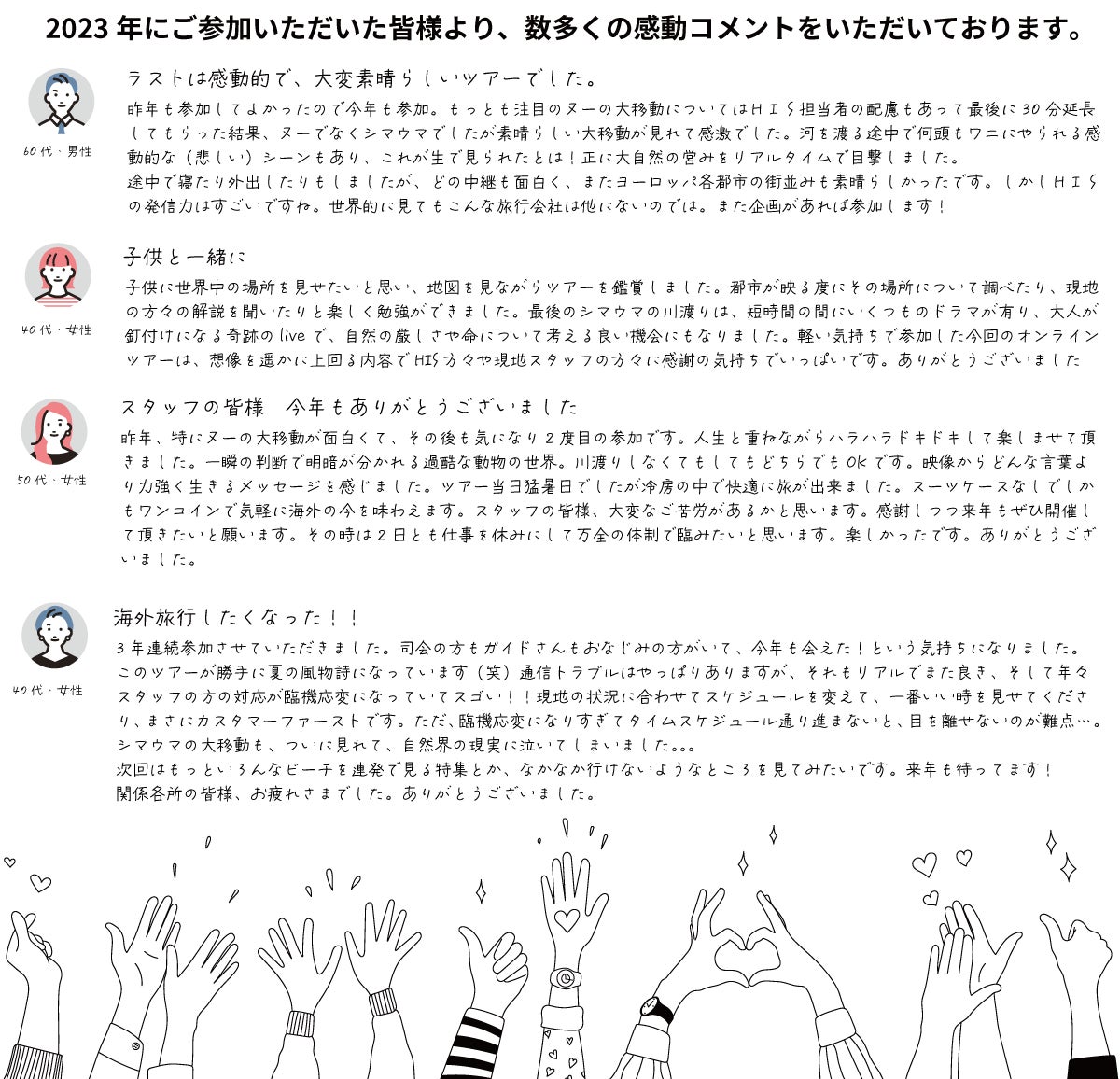 2024/07/23 09:27皆さまこんにちは!24時間ライブツアー運営スタッフです!今年も皆さまのおかげで無事終わり、ホッとしつつもまだ余韻に浸っているスタッフたちが24時間ライブツアーを振り返る座談会を行います。ぜひご参加いただき、一緒に語りませんか。HISスタッフ座談会 第4弾~今年も終わりました!24時間ツアー!日時:7月23日(火)20:00~Youtubeにて無料配信です▼ご予約はこちらhttps://www.his-j.com/oe/detail/T13/?area=O9&country=OEA&city=OEG&product=OEGzadankaiそして、クラウドファンディングも本日23:59までとなります。よろしければぜひ応援をお願いいたします!8月6日に開催する打ち上げ懇親会など、ぜひご参加いただけると嬉しいです。●打ち上げ懇親会ご招待 1端末(オンライン参加) + 御礼メッセージ 4,000円●打ち上げ懇親会ご招待 1端末(オンライン参加)+ IKUxMIRU1年間プラン 1名様分 +御礼メッセージ 25,000円また、好評につき追加したバッグも残り1つとなっております。●追加設定!【タイ雑貨 CHICO バッグ(大) + 御礼メッセージ 4,000円 ▼ご支援・プロジェクトページはこちらhttps://camp-fire.jp/projects/view/759489また、来年も皆さまとお会いできることを期待しつつ。本当にありがとうございました。HIS 24時間ライブツアー運営スタッフ一同 もっと見る【来年開催に向けて】クラウドファンディングは7/23(火)まで
