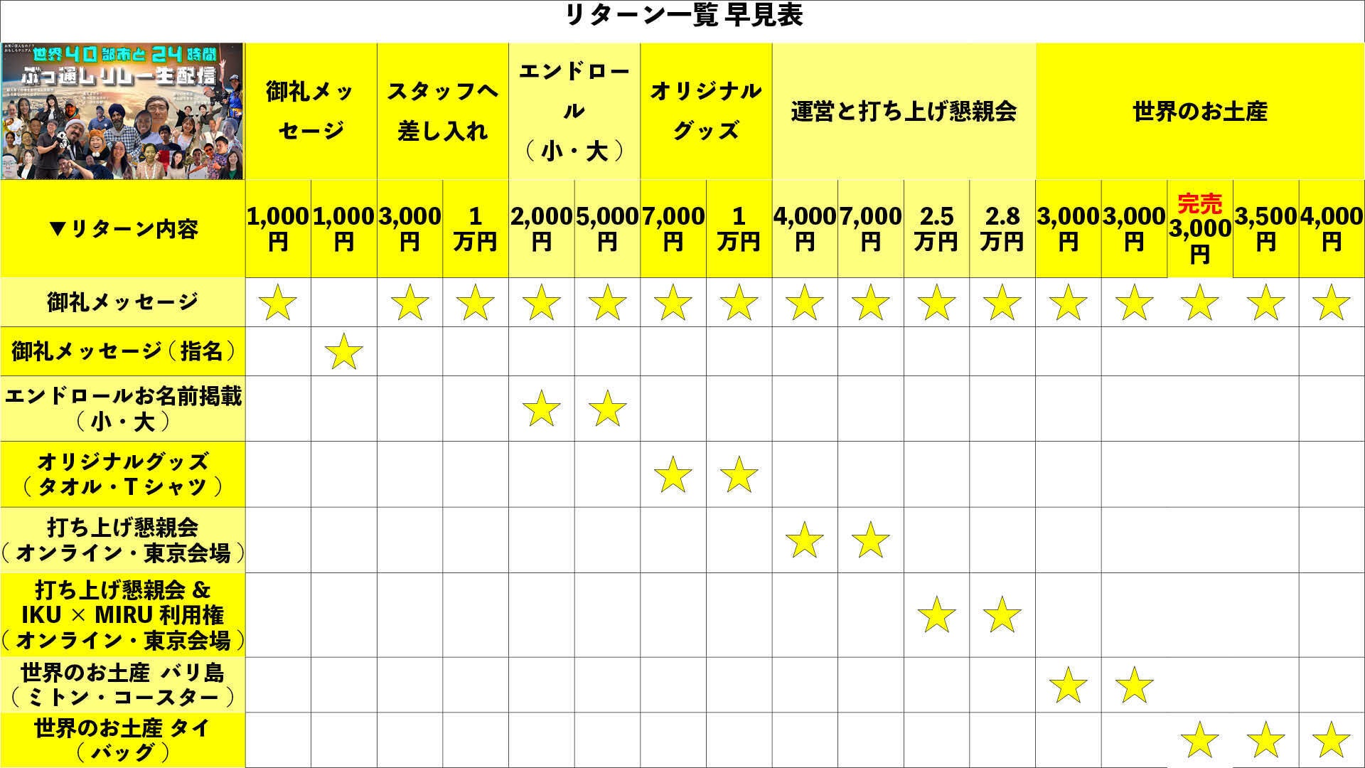 2024/07/14 21:00皆さまこんにちは!24時間ライブツアー運営スタッフです!24時間ライブツアー、ご視聴いただきありがとうございました。様々なトラブルやハプニングがありつつも、無事に完走で来たのは皆さまのおかげと心より感謝しております。ホッとしたと同時に終わってしまってさみしい気持ちのスタッフです。心に残った企画はありましたか?これを見て興味を持った国や都市はありましたか?何か1つでも(2つでも3つでも全部でも)心が動き、実際に行ってみたいな、見てみたいなと思っていただけたら嬉しいです。24時間ライブツアーは終了してしまいましたが、クラウドファンディングは7月23日(火)23:59まで受け付けております。●【興味を持った国や都市への応援+御礼メッセージ】1,000円オリジナルTシャツを着て懇親会に参加されるのはいかがでしょうか。●【24時間オンラインライブツアーオリジナルマフラータオル +御礼メッセージ】7,000円●【24時間オンラインライブツアーオリジナルTシャツ + 御礼メッセージ】10,000円● 【打ち上げ懇親会ご招待 1端末(オンライン参加)+御礼メッセージ】 4,000円● 【打ち上げ懇親会ご招待 1端末(東京会場参加)+御礼メッセージ】 7,000円もしよろしければ応援いただけますと嬉しいです。本当に2日間にわたり、お祭りイベントを盛り上げていただきましたこと感謝いたします。ありがとうございました!24時間ライブツアー運営スタッフ一同 もっと見る