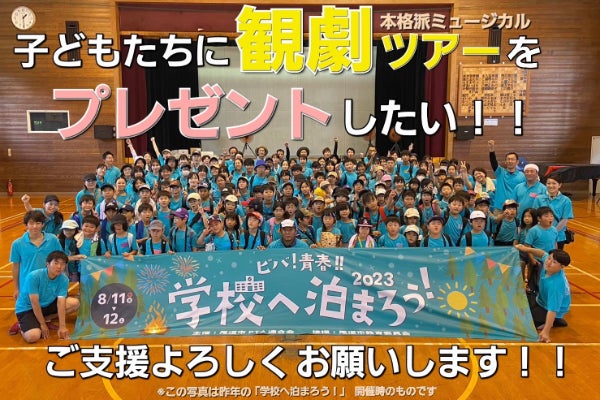 そして!今年はさらにパワーアップ!子どもたちに「ホンモノの観劇の感動」を味わってもらいたいという想いから、某劇団の本格的ミュージカルの観劇に100名無料招待したいと思っております。(上記の「学校へ泊まろう!ももちろんやります!)