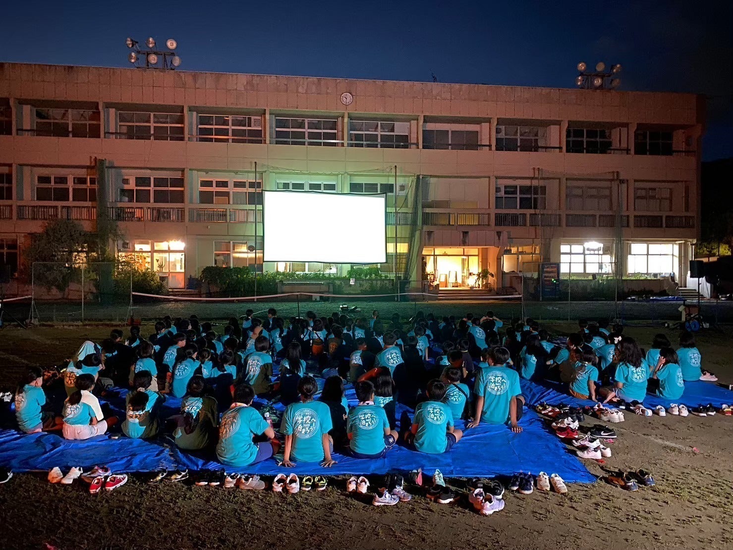 星空のもと、学校の運動場でみんなで映画を観覧する「星空映画祭」、