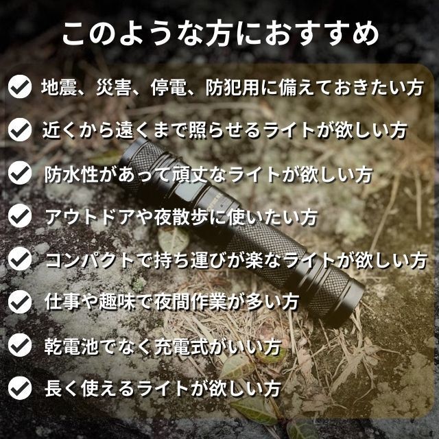 使用時間:高モード:約180分・中モード:約540分・小モード:約900分・ストロボモード:約180分・SOSモード:約540分