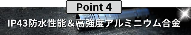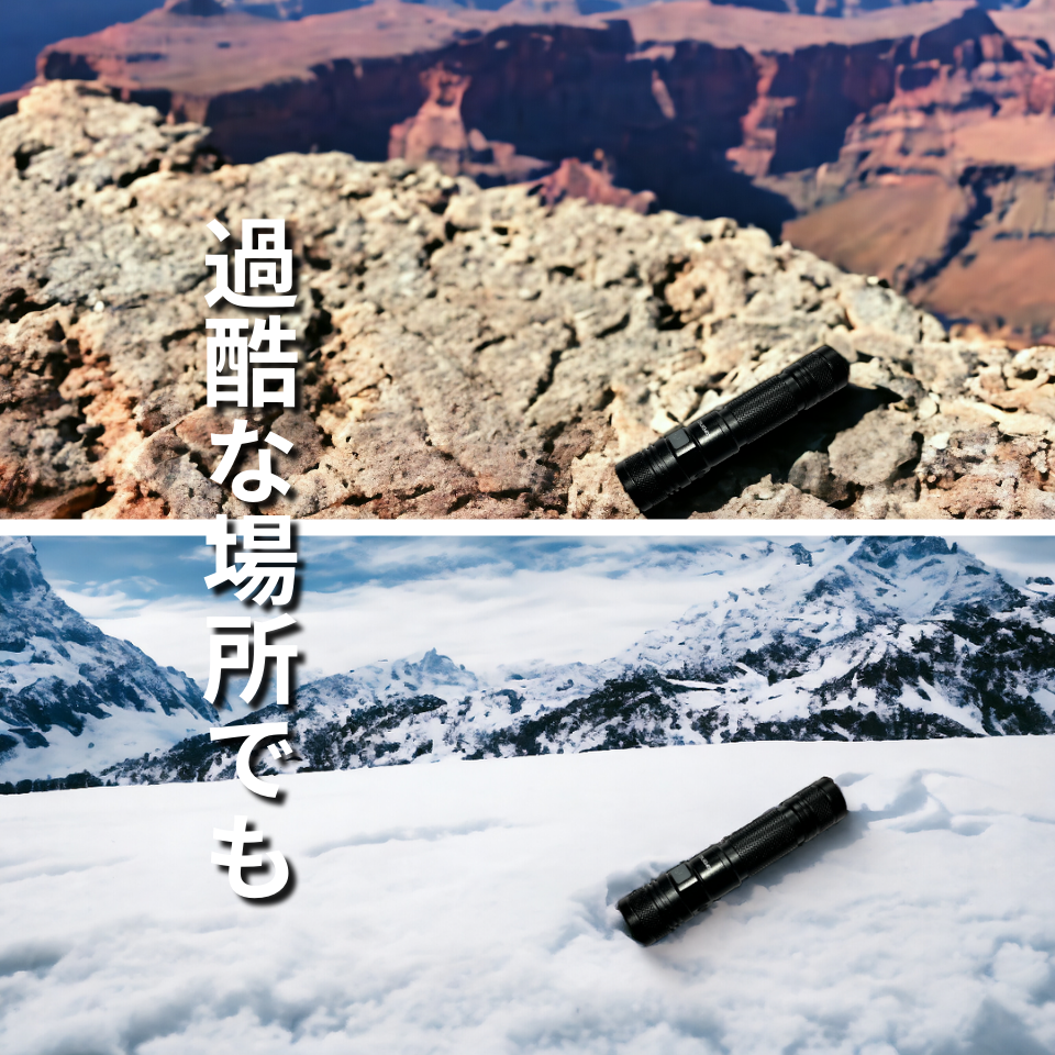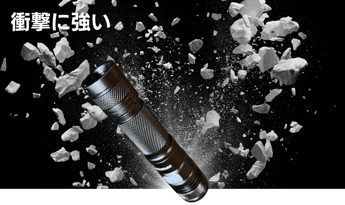 通常のプラスティック製や安価な懐中電灯は、落とすと破損の恐れがあります。しかし「AGLON2」のボディーは飛行機や宇宙船に使用される超頑丈な航空宇宙アルミニウム合金で出来ており、多少の衝撃や圧力が加わっても壊れない耐衝撃性を備えています。