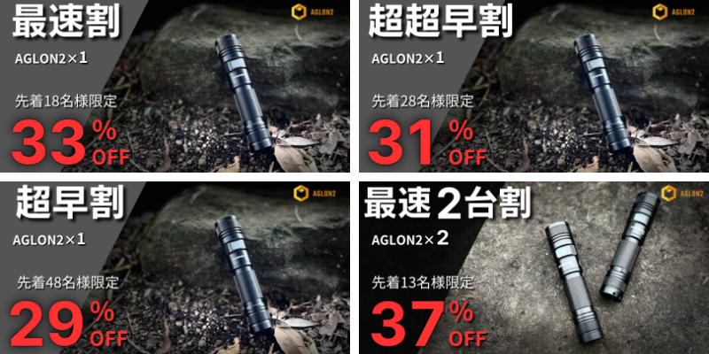 今回、高強度フォーカスLEDライト「AGLON2」を限定特別価格でご提供させて頂きます。他に類を見ないライトで、ワイド⇔ビーム自由自在の2WAY。しかも航空宇宙アルミニウム合金ボディーで高耐久で高強度。またコンパクトでカッコいいデザインで一目見て気に入りました。このライトひとつあれば地震や災害時の備えにもなり、アウトドアや普段使いにも重宝します。実用性が有り、緊急時にも役に立つ「AGLON2」を皆様にお届け出来るのを楽しみにしております。是非、あなたの相棒として側に置いていただけたら幸いです。精一杯プロジェクトに取り組んで参ります。皆様からのご支援を心よりお待ちしております。