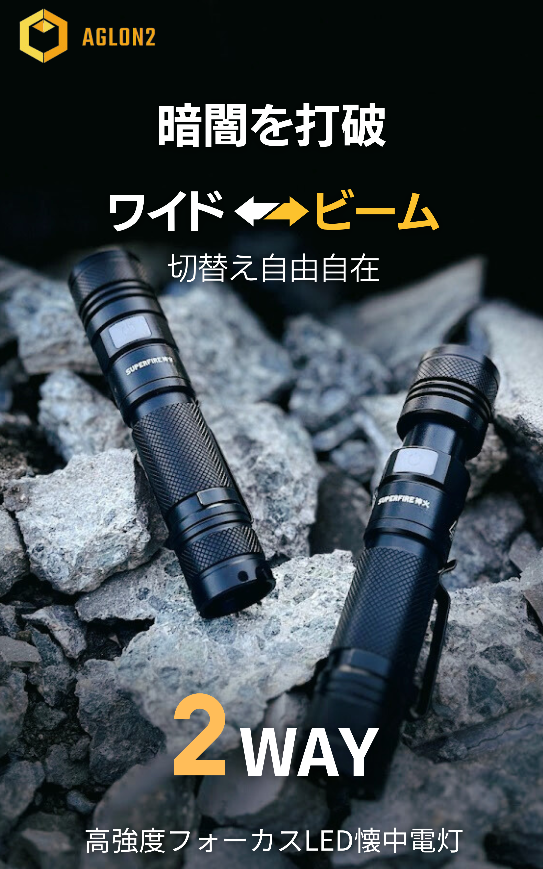 「AGLON2」は1台でワイド(広角照射)からビーム(スポット照射)の2WAY!さらに本体は超頑丈な航空宇宙アルミニウム合金で制作!衝撃に強く、地震、災害、緊急時、アウトドア、日常使いまで様々なシーンで大活躍します。