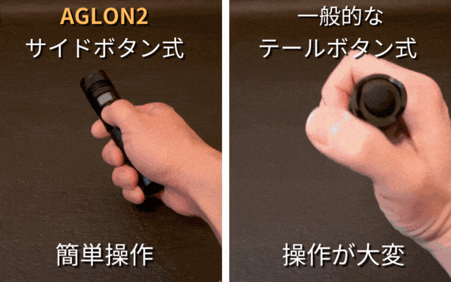 AGLON2は操作が簡単なサイドボタン式。通常のテールボタン式に比べてライトを持ち替えたり両手を使う必要無くスムーズに操作できます。