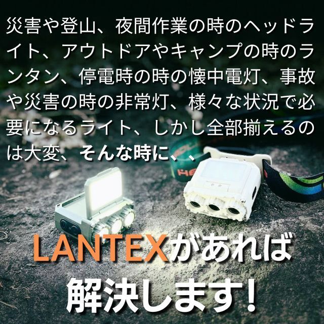 今回、4WAY高性能ヘッドライト「LANTEX」をmachi-yaだけの特別価格にてご提供させて頂きます。他に類を見ないライトで、ヘッドライト、ランタン、懐中電灯、非常灯の4WAY、1300ルーメンの眩しいほどの明るさで高性能で頑丈でコンパクト、またカッコいいデザインで一目見て気に入りました。このライトが一つあれば日常生活からキャンプ、アウトドア、防犯、災害時の備えにもなり、自信をもってお勧めします。実用性が有り、緊急時にも役に立つ「LANTEX」を皆様にお届け出来るのを楽しみにしております。